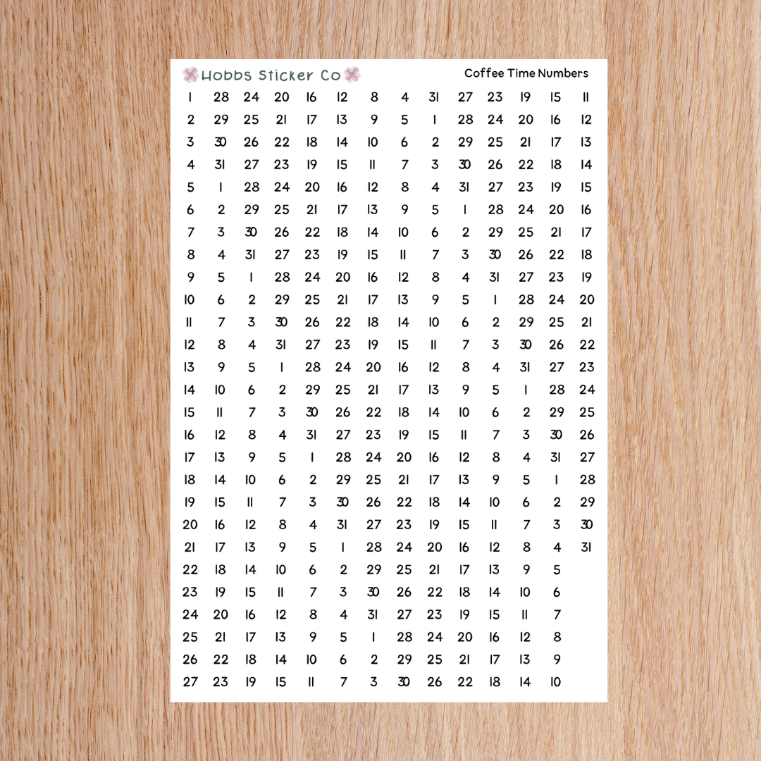 - Enough Numbers (two sheets) to set up all 12 months and 52 weeks