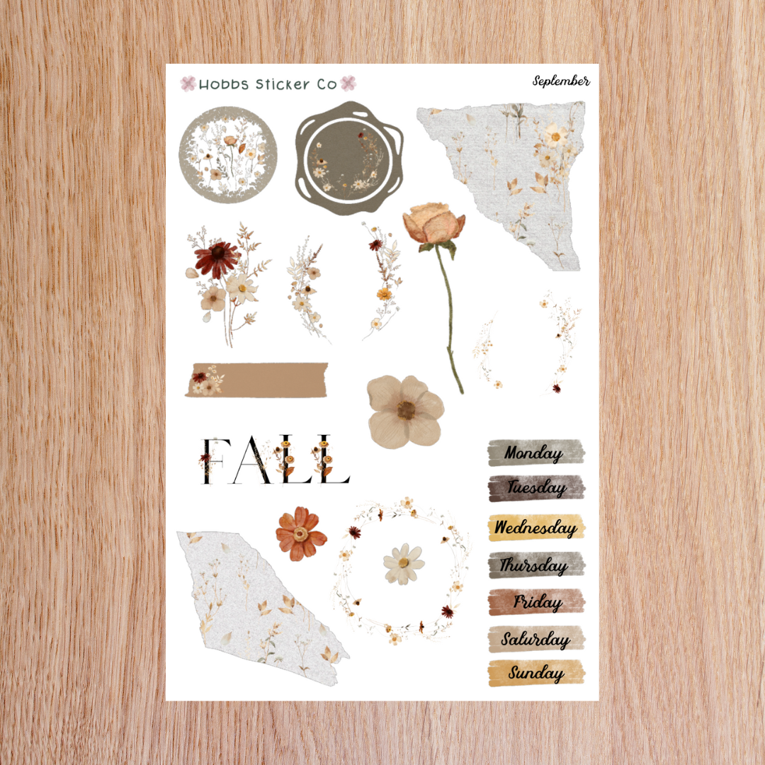 Fall has always been my favorite time of year. I love when crisp fall mornings make way for sunny and breezy afternoons. That is the essence of the September collection. Add a bit of autumn to your planners and journals with these warm colored florals! This journaling page includes decorative elements as well as scripts for the days of the week. Perfect for a weekly planning or journaling spread!